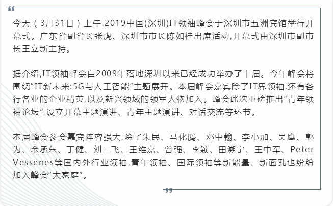 2019年3月31日,第十一届中国(深圳)IT领袖峰会上,腾讯公司董事会主席兼首席执行官、“预言家”马化腾再次站台,就《5G与AI推动教育产业互联网发展》发声,预言了5G与AI在教育领域的六大应用。