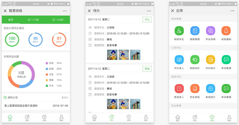 当今,微信已经是我们沟通必不可少的渠道之一,老师在面对一个班甚至多个班孩子及家长时,往往要建立多个群组,不便管理,而且群里家长素质高低不一,同样致使老师对家长发言不易管理。某些数据表格如果在群里公开张贴过于简单粗暴,例如:学生成绩如果是一单一发送,势必大量增加老师工作量,现在国家提倡素质教育,学生成绩属于隐私不允许公开发布。所以,“智慧班级”针对这一现状,将老师记录或是表格进行优化,将数据轻松采集并且一对一单独发送,每个学生及家长只能收到与自己对应的数据,像家长只能查看自己孩子在校的成绩和表现情况,而不能接收其他同学的数据,避免了原来简单粗暴的张贴,同样也大量减少了老师的工作量。
