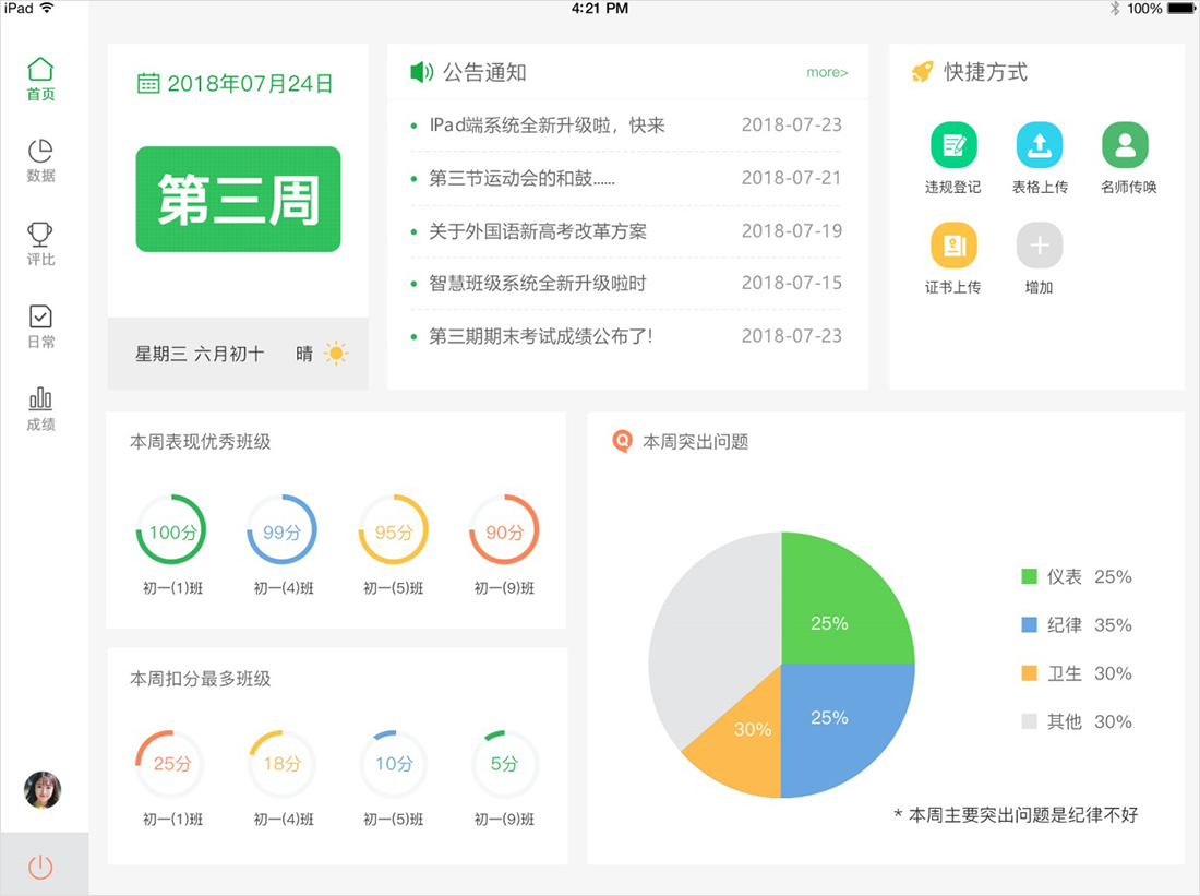 为了促进质量教育,学校有量化班级制度分,可针对班级或是学生进行量化加/减分;学生每日作业老师都会进行作业质量评级;学生每个年级各科成绩评价;学生成长报告单等。汇总比较困难,而且不能实时录入和产生评价,“智慧班级”可针对学生实时数据的录入及时产生数据统计甚至评价。学生作业分析统计表、日常行为统计表、学生成长报告表、学生成绩统计表等有数据录入并能实时统计并生产报表,减少老师统计工作和及时反馈到家长学生的在校表现情况。