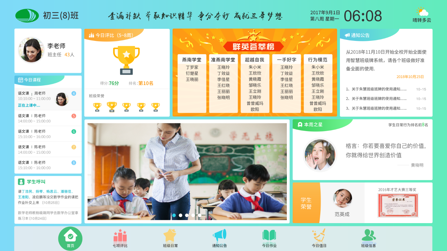 通过平台,可展示本班荣誉,学生荣誉,班训,教师格言,学生格言,学生活动剪影,每周一星,教育视频等。