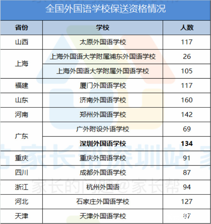 2018年全国各地外校的保送名单中显示,广东全省共计203个保送名额,深外占了134个,其中100名为女生,34名男生。外语高中保送出口一般为北大、清华、人大、南开、浙大、北外等国内顶级高校。共计有11名学子被清华北大录取,其余分别被复旦大学、浙江大学、北京外国语等国内重点高校录取。