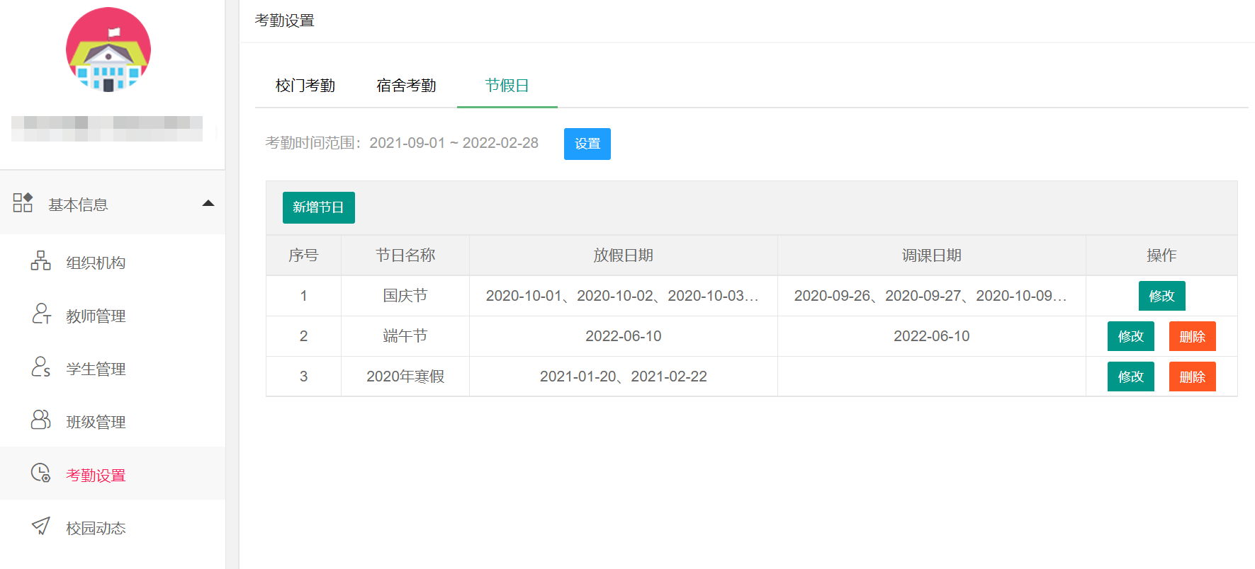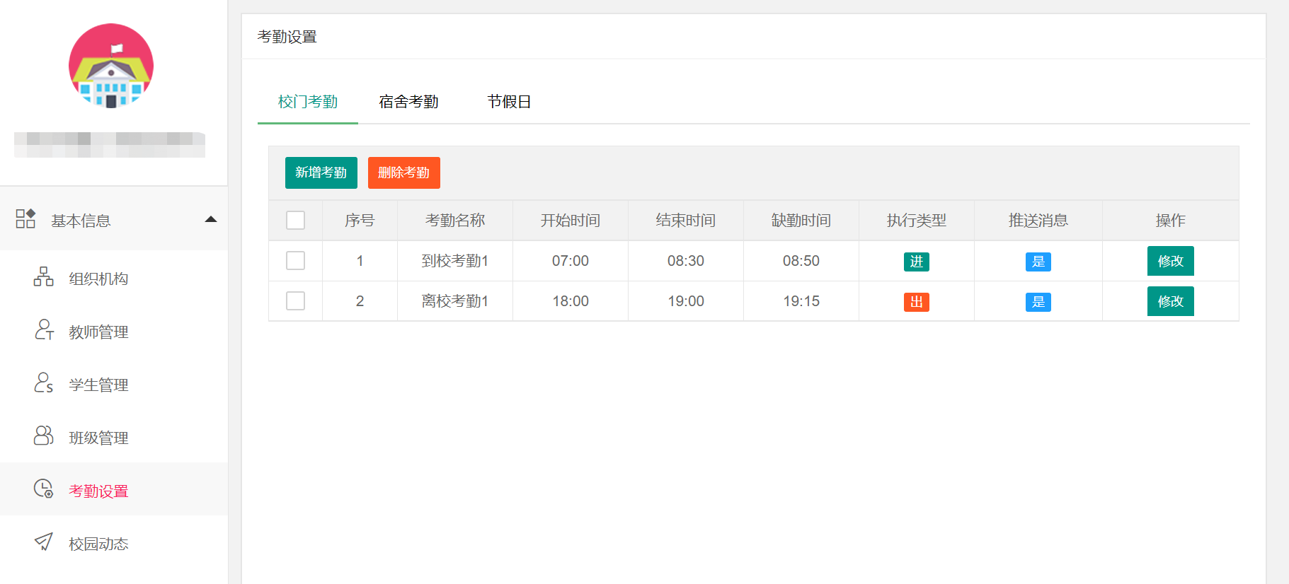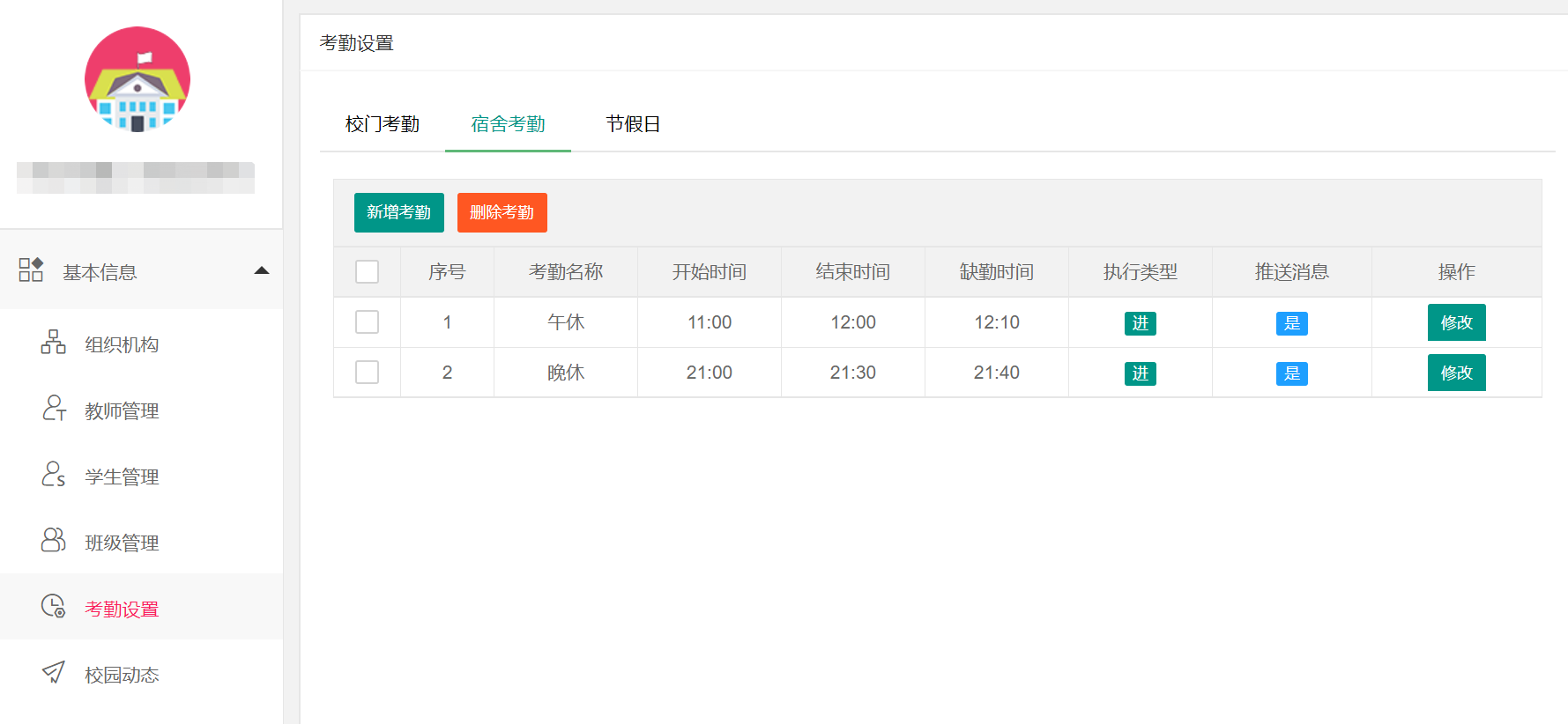 用户可根据实际需求自定义设置考勤,分别为校门考勤设置,宿舍考勤设置,以及节假日考勤设置。