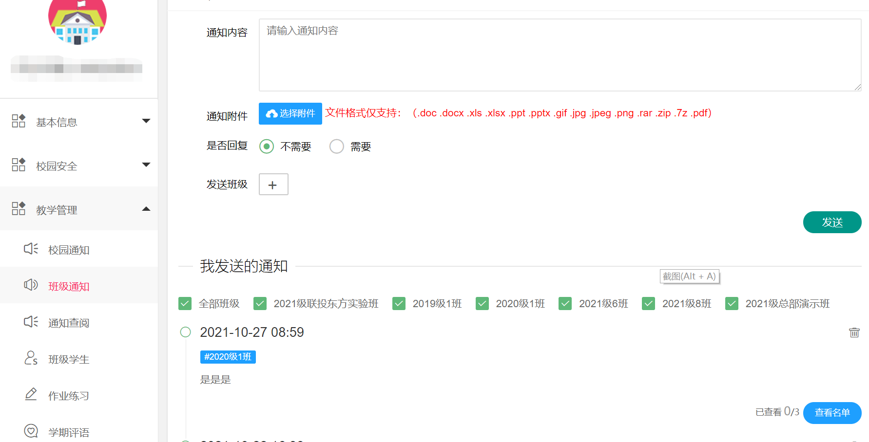 对班级关联的所有联系人的设备进行多种形式的信息推送,保证信息传播的有效性。