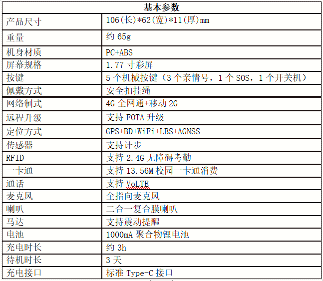 产品采用1000-1450mAh电池容量,超长续航,7天无需充电。达到IP67防水级别,同时打通了支付宝,微信支付、健康码、行程卡:WIFI+GPS+LBS定位;让孩子远离威胁;白名单亲情号添加,SOS紧急报警,轨迹查询,低电量报警提醒等实用功能。